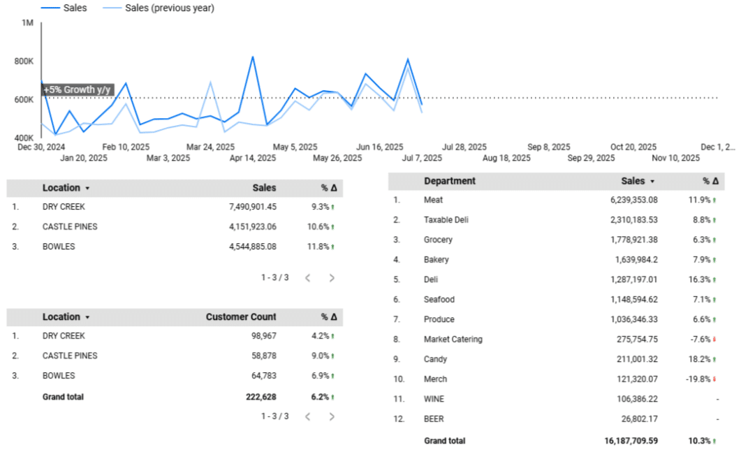 Among the dashboard reports are year-over-year sales by department, by location, and customer count. Using the dashboard, we were able to visually identify trends that helped with campaign planning, such as adding extra support for specific locations or products.